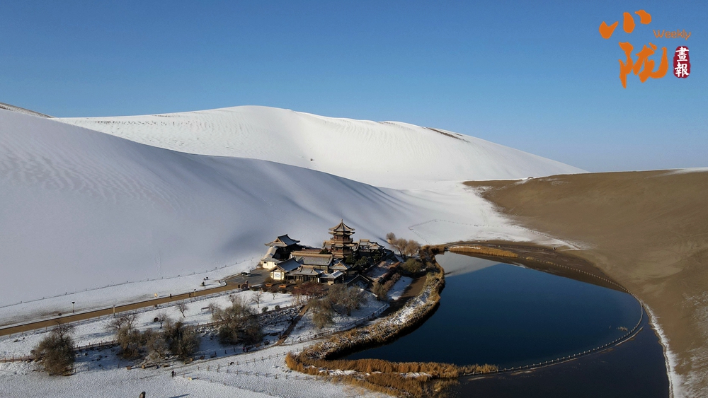 敦煌下雪之后,一半沙漠一半雪。冬日暖陽下,月牙泉像一面鏡子,將沙漠映照得更為浪漫,讓人產(chǎn)生無限遐想。