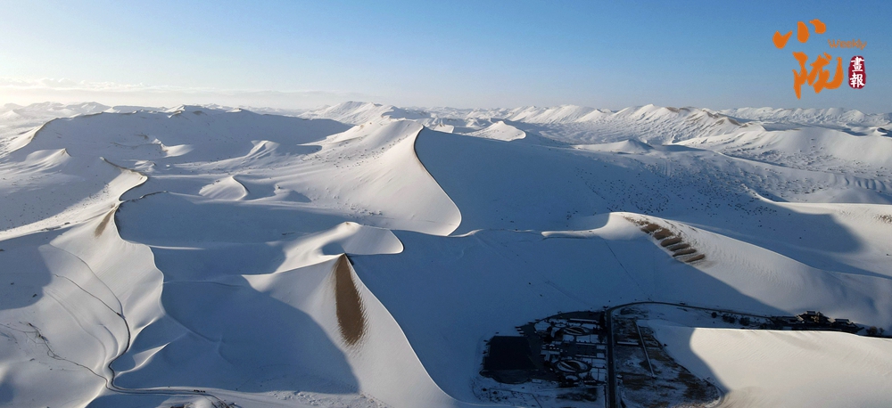從空中俯瞰,漫漫沙漠覆蓋著白雪,月牙泉成了沙漠的眼睛,構(gòu)成另一幅美麗的沙海畫卷。