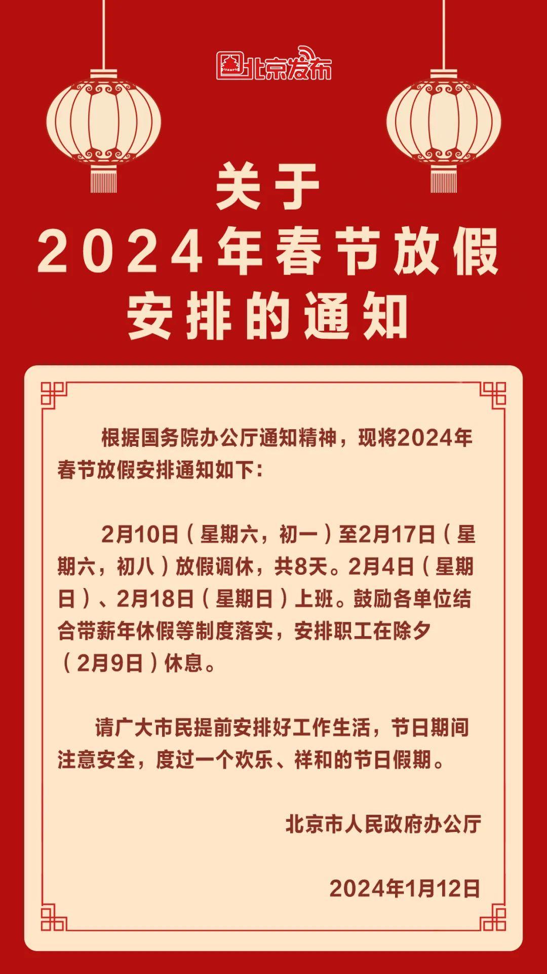 1月12日,北京市人民政府辦公廳正式發(fā)布關于2024年春節(jié)放假安排的通知。通知稱,2月10日(星期六,初一)至2月17日(星期六,初八)放假調(diào)休,共8天。2月4日(星期日)、2月18日(星期日)上班。