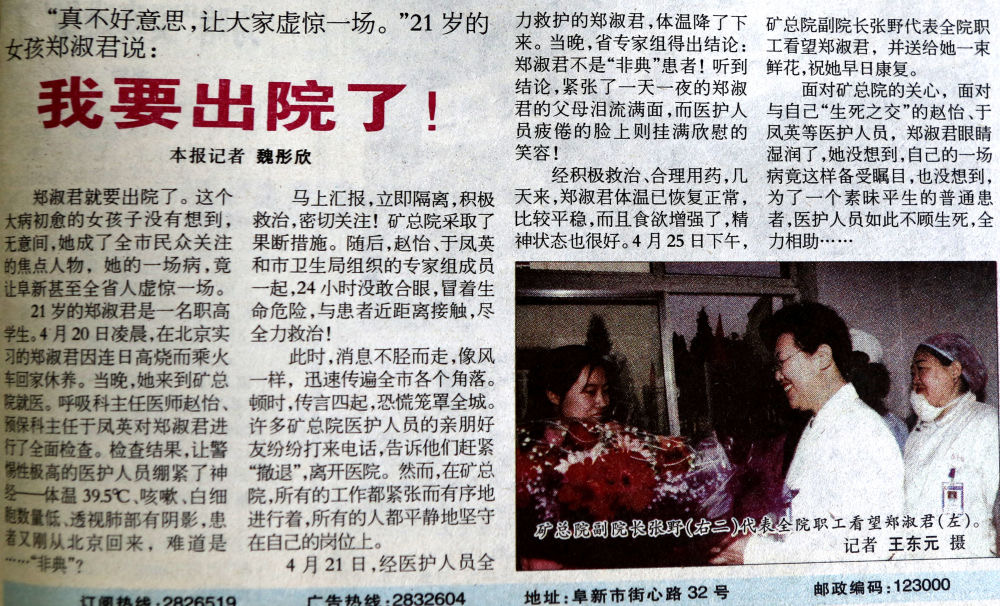作為部門領(lǐng)導(dǎo),她依然表現(xiàn)出色,2003年“非典”期間,她擔(dān)任阜新晚報(bào)要聞部主任,她提出“最危險(xiǎn)的地方,我先上!”4月20日,有一個(gè)學(xué)生從北京回來,因?yàn)楦邿煌吮粦岩蔀楦腥?ldquo;非典”,一時(shí)間謠言四起,恐慌籠罩全城,魏彤欣一個(gè)人冒著風(fēng)險(xiǎn)深入醫(yī)院跟蹤采訪,在得知確診不是“非典”后,第一時(shí)間發(fā)出了報(bào)道《我要出院了》,及時(shí)消除了公眾恐慌情緒。她帶領(lǐng)記者深入發(fā)熱門診、城市出入口的檢查站和醫(yī)護(hù)人員之間,掌握了大量的一手材料,共采寫了70余篇稿件,她本人被評(píng)為“遼寧省抗擊非典新聞宣傳先進(jìn)個(gè)人”,她所在的部門被評(píng)為“遼寧省抗擊非典新聞宣傳先進(jìn)集體”。
