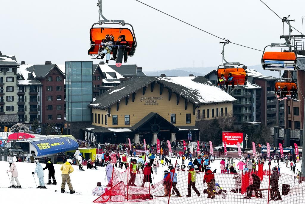 滑雪愛好者在吉林省吉林市萬科松花湖度假區(qū)滑雪。新華社記者許暢 攝