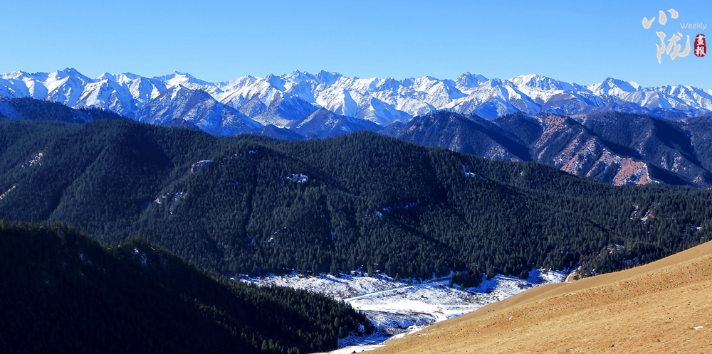祁連主峰在藍(lán)天白云的映襯下顯得肅穆大氣。周圍群峰羅列、層巒疊嶂,高低延綿的山脈在陽(yáng)光的照耀下交相輝映,近處的群山被此起彼伏的林海包圍,像一道道五彩的波浪,郁郁蔥蔥,生機(jī)盎然。