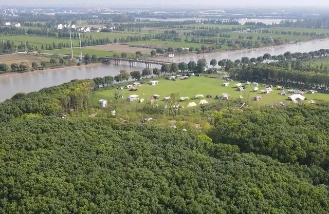 在上海松江區(qū)一處營(yíng)地,市民游客在河邊草地上搭起帳篷。(2023年9月29日,無(wú)人機(jī)照片)。新華社記者 方喆攝