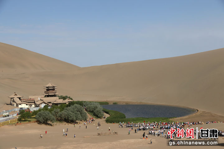 6月1日,游客在甘肅省敦煌市鳴沙山月牙泉景區(qū)游覽。張曉亮 攝