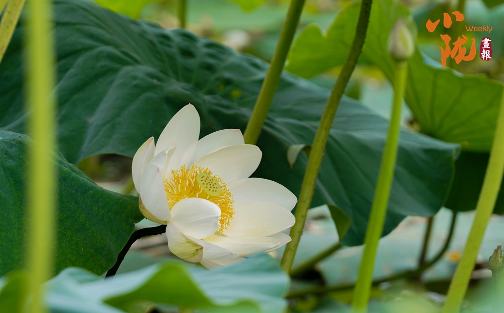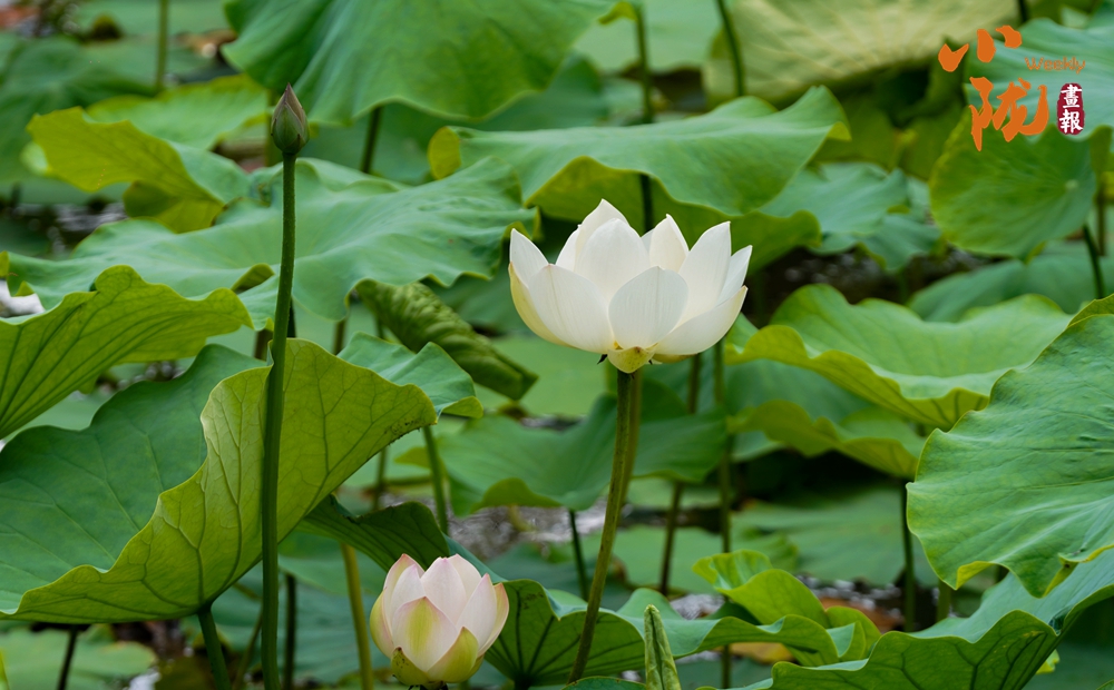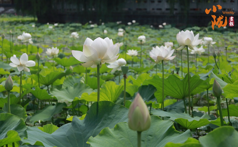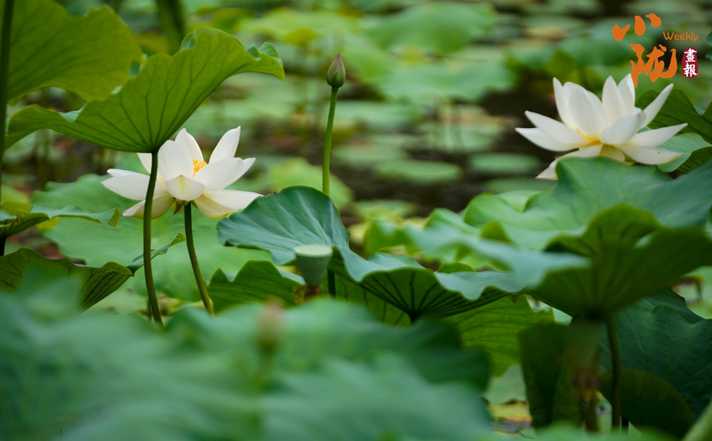 一朵朵、一簇簇、白色的荷花星星點(diǎn)點(diǎn)、清美動人點(diǎn)綴于成片的翠綠色荷葉間或肆意怒放,或含苞待放形成一幅美麗的生態(tài)畫卷。