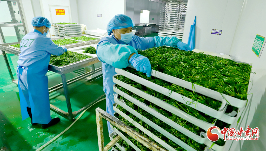 8月8日,臨澤縣沙河鎮(zhèn)一麥苗凍干粉生產(chǎn)線上,工作人員正在進行分揀、清洗、高溫漂燙、翻晾裝盤、凍干研磨等生產(chǎn)工序,完成廣東、福建、上海、浙江等地客商的訂單。
