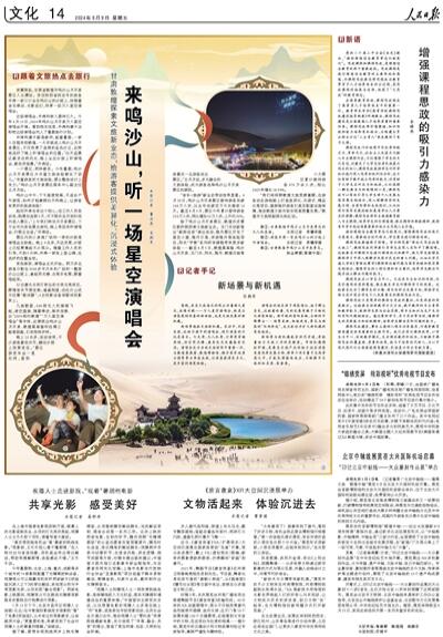 新場景造就文旅新機遇。采訪中,記者發(fā)現(xiàn),這場沙漠中的演唱會,吸引游客的不僅是音樂。燈光秀、無人機秀、沙屏秀穿插亮相,炫彩熒光棒、鹿角發(fā)光發(fā)箍備受歡迎。演唱會成為當?shù)匚穆镁仃囍兄匾画h(huán),與敦煌莫高窟、敦煌博物館、雅丹國家地質公園等景點串連成線,讓游客獲得更多元、更豐富的游覽體驗。