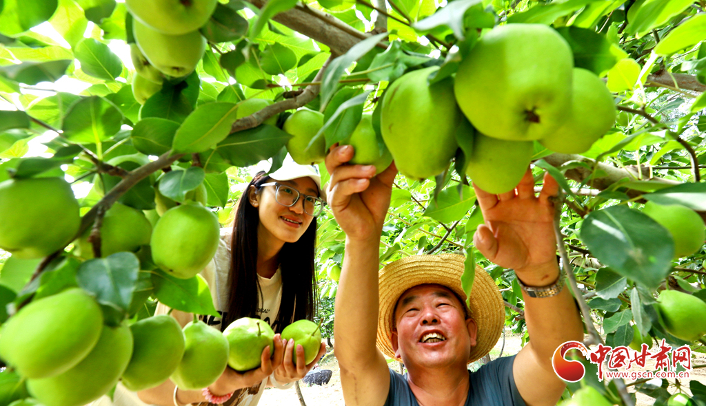 8月12日,在張掖市甘州區(qū)農(nóng)墾張掖農(nóng)場(chǎng)綠色果品種植基地,果農(nóng)們正在采摘成熟的早酥梨,基地里一派果豐人忙的喜人景象。