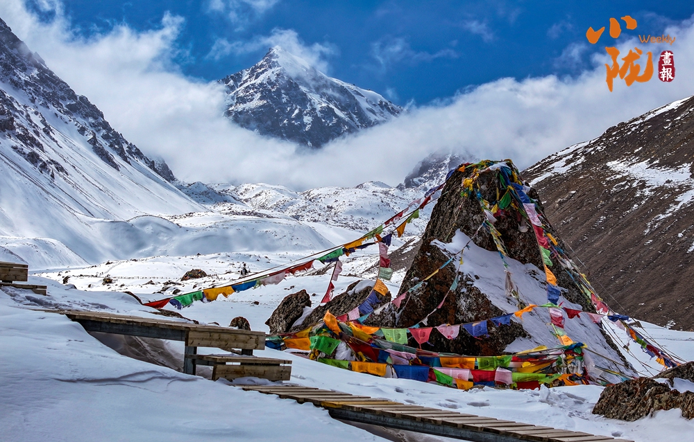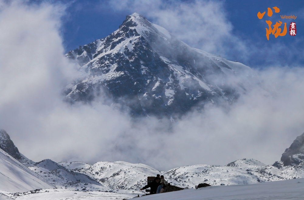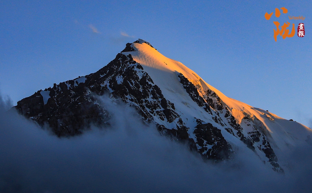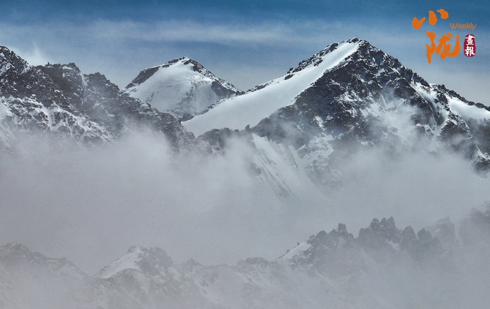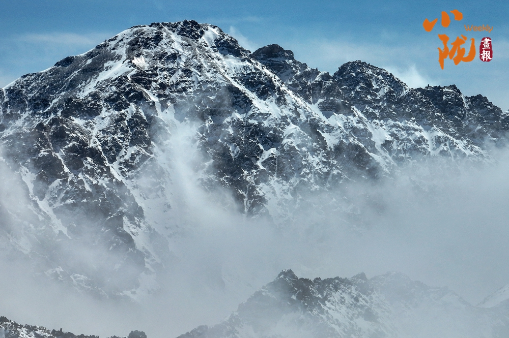 雪山山巒間,云霧回旋飄動(dòng),彌漫舒展,如海浪起伏、波濤滾滾一般,與湛藍(lán)天空相互映襯,壯美如畫。