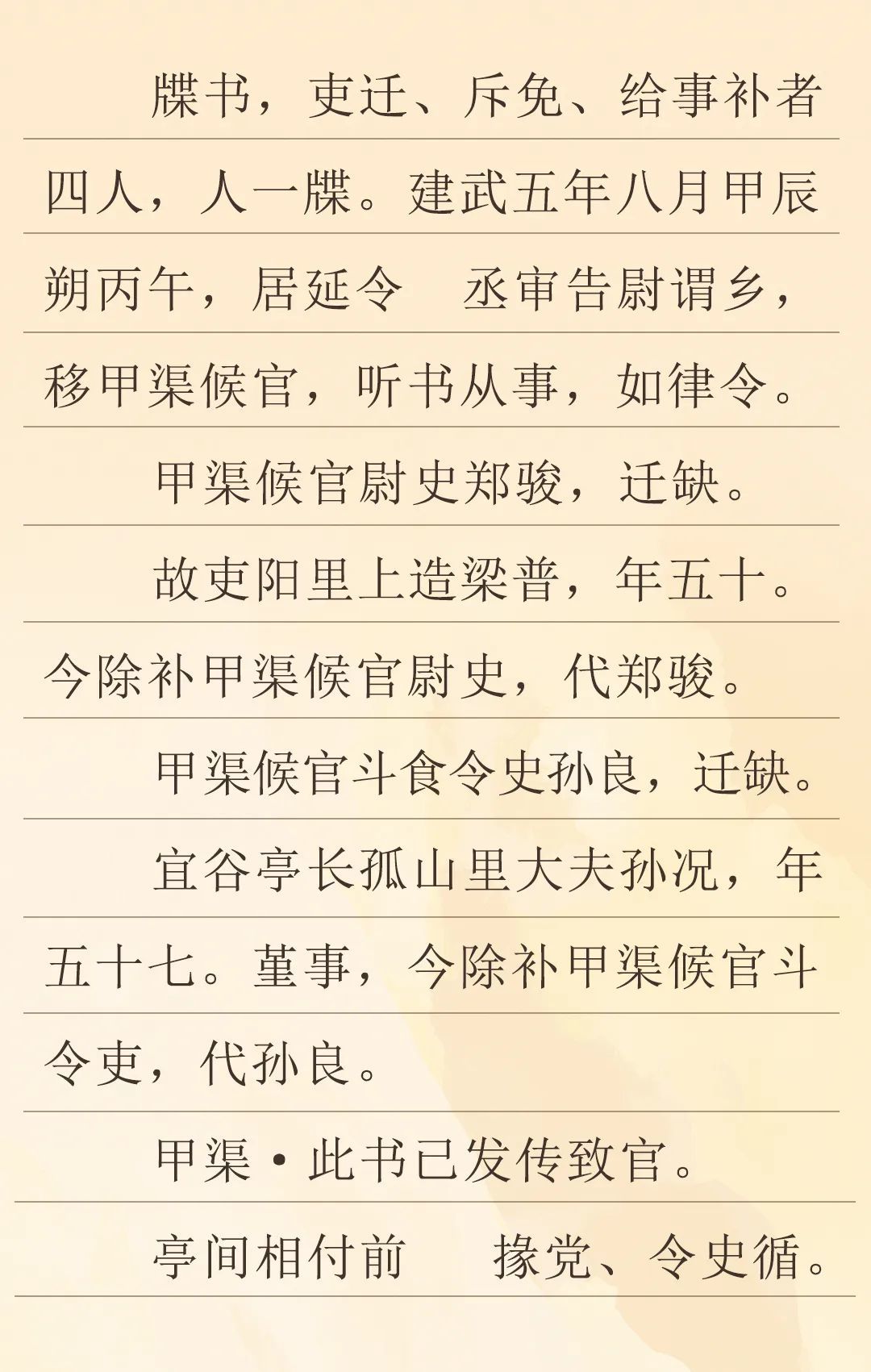 這是一份距今1995年的地方官員任命書(shū)。當(dāng)時(shí)是東漢建武五年八月,在漢代張掖郡居延邊塞的甲渠候官進(jìn)行了人事調(diào)整,對(duì)官吏進(jìn)行了任免。一個(gè)是甲渠候官尉史鄭駿升遷,由五十歲的梁普補(bǔ)缺;另一個(gè)是甲渠候官斗食令史孫良升遷,由五十七歲的原宜谷亭長(zhǎng)孫況代任,其中提到孫況做人低調(diào)、行事嚴(yán)謹(jǐn)(即“謹(jǐn)事”)。這次人事調(diào)整是由居延縣負(fù)責(zé)。