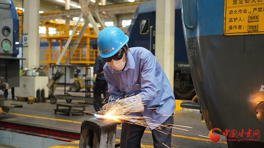 身穿長袖工作服、腳蹬勞保鞋、頭戴藍(lán)色安全帽,手上戴著電焊專用防護手套……蘭州鐵路局蘭州西機務(wù)段西整備車間電焊班組內(nèi),鐵路“焊將”劉偉偉在火花四濺、煙霧彌漫的工作臺位間來回穿梭,一點一點對機車車鉤鉤尾墊進行焊修。