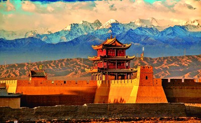 雄關(guān)六百載,長(zhǎng)城越千年??唇癯瓯谥?,嘉峪關(guān)關(guān)城的朱色城樓與終年皚皚的祁連雪峰交相輝映,歷經(jīng)風(fēng)霜久而彌堅(jiān);峭壁之巔,長(zhǎng)城第一墩矗立于此,腳下流淌的討賴河水澎湃不息;山脊之上,懸壁長(zhǎng)城形似凌空倒掛,氣勢(shì)雄偉。