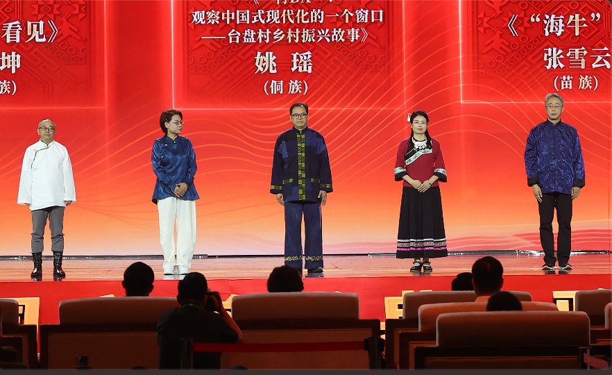 吉米平階、牛海坤、姚瑤、張雪云、周建新領(lǐng)取第十三屆全國少數(shù)民族文學創(chuàng)作駿馬獎報告文學獎。