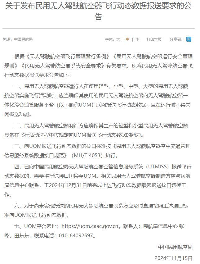 11月15日,民航局發(fā)布《關(guān)于發(fā)布民用無人駕駛航空器飛行動(dòng)態(tài)數(shù)據(jù)報(bào)送要求的公告》(以下簡稱《公告》)。