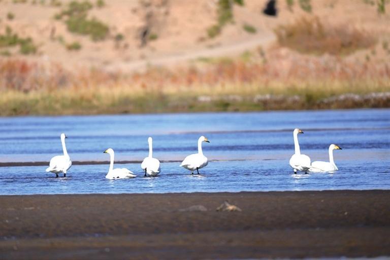 近日,高臺縣黑河濕地多次監(jiān)測到大天鵝種群,它們的翩翩降臨,標志著天鵝一年一度的越冬之旅正式開啟。 大天鵝是雁形目鴨科天鵝屬鳥類,又稱黃嘴天鵝,全身潔白,僅頭稍沾棕黃色;喙黑色,上喙基部黃色,喙端黑色;跗跖、蹼、爪也為黑色,是國家二級保護動物。天鵝對棲息地的選擇極為苛刻,它們的到來是高臺縣黑河濕地生態(tài)環(huán)境質量優(yōu)良的有力證明。
