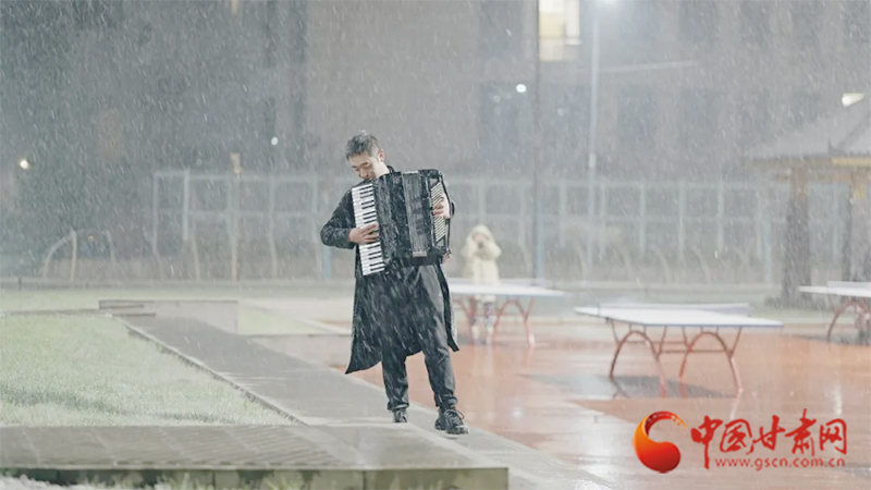 鏡頭中,在蘭州大學(xué)榆中校區(qū),手風(fēng)琴聲伴隨著雪花,一位同學(xué)在雪中輕輕擺動(dòng)著身體,引得過(guò)路的同學(xué)駐足欣賞。