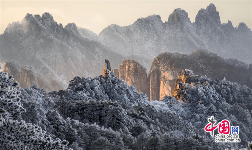 11月25日夜,安徽黃山風景區(qū)迎來入冬首場降雪。26日,雪后初霽,五百里黃山銀裝素裹、分外妖嬈。山峰、奇松、怪石在朝陽的關愛下披上了一層金色的外衣。松林相間雪花層疊,熠熠生輝,翠色與銀白交織,宛如瓊枝玉樹,讓人流連忘返。