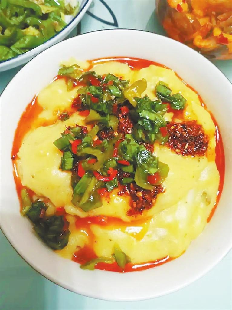 馓馓飯,要用新玉米面,今年新磨的,馓的飯才顏色亮,入口香。舊面就不行,咽口里,粗糙。燒半鍋水,水滾,翻白花。母親站鍋前,右手執(zhí)長筷,在鍋里攪,左手抓一把面,手指慢慢蠕動,滑潤的玉米面在指縫里,均勻地落下去,水上面一層細密的泡。一直攪,一直撒面,筷子不能停,停了便凝成面疙瘩。這時候,火要旺,火一小,就生了。最好是木柴火,火勢大,有后勁,茂盛的火苗才能伸著紅舌頭舔著黑鍋底。母親說,“人心要實,火心要虛。”鍋面上,熱氣騰騰。白霧氣從廚房門涌出,像白馬,翻四蹄,跑進了落著雪花的天上去。