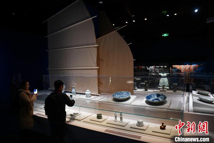 12月21日,“傳奇之旅:馬可·波羅與絲綢之路上的世界”展覽在四川博物院正式面向公眾開放。圖為觀眾參觀現(xiàn)場展出的中國元代青花瓷系列展品?!≈行律缬浾?nbsp;張浪 攝