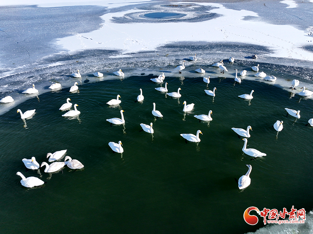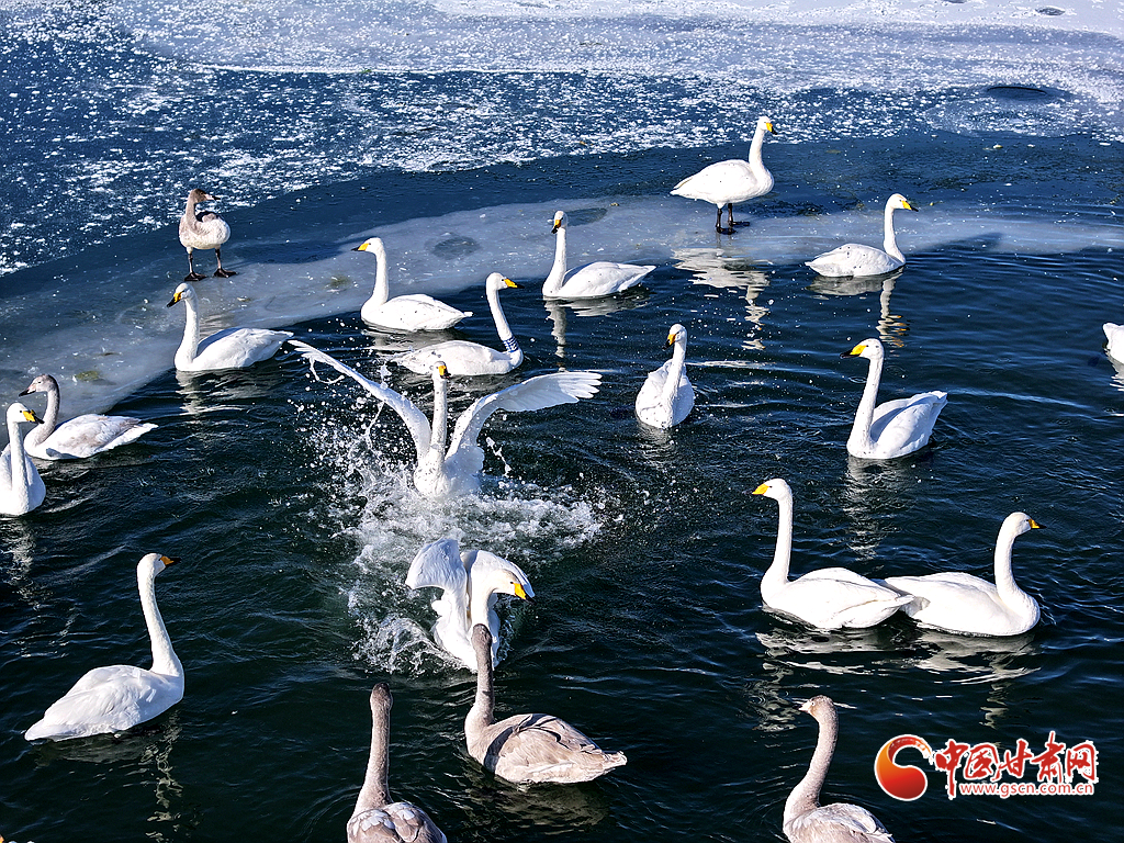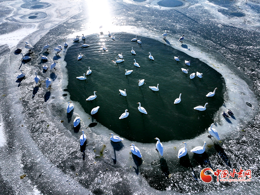 近日,在甘肅省張掖國家濕地公園,成群的越冬天鵝在冰封的湖面上悠然覓食、嬉戲,構(gòu)成了一幅動人的生態(tài)畫卷,成為冬日里一道尤為引人注目的風景線。