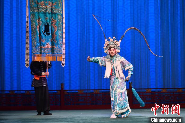 30日晚,“閩臺(tái)共譜梨園曲·不負(fù)韶華正青春”兩岸傳統(tǒng)文化交流系列活動(dòng)在福州鳳凰劇院舉辦。圖為臺(tái)灣青年演員楊瑞宇在京劇《扈家莊》里飾演扈三娘。中新網(wǎng)記者 呂明 攝