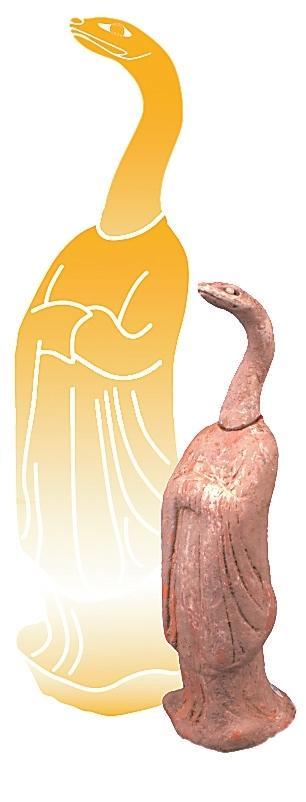 伏羲和女媧是中國神話傳說中的創(chuàng)世神靈,被視為人類文明的始祖。相傳他們均為蛇身人首的形象,象征著自然與人類的和諧統(tǒng)一。伏羲被認(rèn)為是發(fā)明八卦、結(jié)繩記事的智者,開啟了中華文明的智慧之門;而女媧則以其神力摶土造人,煉石補(bǔ)天,維護(hù)了天地的秩序。展覽中展出的高臺(tái)縣博物館館藏的一件魏晉時(shí)期的女媧圖彩繪壁畫磚。畫面繪女媧,人首蛇身,獸足,頭梳高髻,著交領(lǐng)紅裳,右手持月輪,月輪內(nèi)有蟾蜍,左手持規(guī),周圍繪云氣。同時(shí),還展出了一件高臺(tái)縣博物館館藏魏晉時(shí)期的伏羲女媧畫像磚,左側(cè)女媧,一手持矩、一手拿陰物,人首、蛇身、獸足、挽高髻、著交領(lǐng)長(zhǎng)衣,腹部繪月輪;右側(cè)伏羲,右手持規(guī),左手持日,內(nèi)有一金烏,周圍云氣環(huán)生,意在天界暢游。兩磚拼合形成陰陽交合圖,為墓葬中室頂部藻井彩繪圖像。畫像中人首蛇身的伏羲、女媧形象,濃縮著中國上古時(shí)代的蛇崇拜意識(shí)。我國古代有天圓地方之稱,伏羲執(zhí)規(guī)象征天,女媧執(zhí)矩象征地,反映了墓主人追隨升天的愿望,也期望其后代能夠繁衍生息。