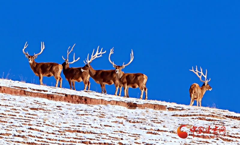 畫面顯示,在白雪皚皚的祁連山之上,五只白唇鹿駐足停留,仿佛也在欣賞祁連山美景,這些白唇鹿體態(tài)壯碩、動作靈活,在鹿群“首領”的帶領下越過山坡,前往下一個覓食地。