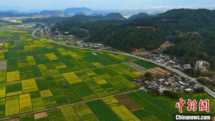 近日,云南省騰沖市界頭鎮(zhèn)成片的油菜花盛開,吸引不少游客前來觀光。金黃的油菜花海與遠處白墻黛瓦的村落相映成趣,共同繪就一幅寫意的水墨畫。圖為油菜花田航拍。趙輝  攝