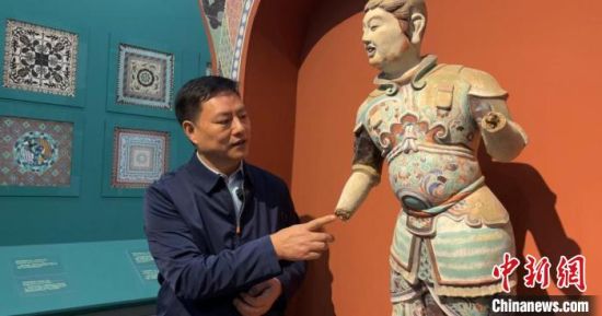 2023年2月,甘肅省蘭州市,汪萬福在敦煌藝術(shù)館向中新社記者介紹莫高窟第194窟南方增長(zhǎng)天王塑像復(fù)制過程?!⊥跄劣?nbsp;攝