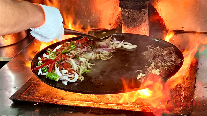 如今,炒撥拉已經成為山丹人日常生活中不可或缺的一部分。在焉支巷子,游客可以看到多家炒撥拉店,每家店都有其獨特的炒制技藝和風味。店家將切好的羊肝、肺、肚、腸、心等佐以洋蔥、青椒下入一個鑄鐵鏊子里,再加上幾勺鹽和辣椒面,開始用猛火爆炒?;鹦撬臑R,一頓撥拉之后,待到七分熟左右再放入提前準備好的白餅塊一起翻炒即可。不一會兒,一鍋美味可口、熱熱乎乎的炒撥拉就制作完成了。
