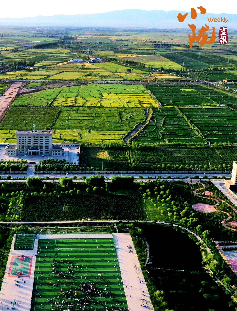 廣袤無邊的田野生機盎然,金黃色的油菜花夾雜著一塊塊碧綠色的麥田,好像給大地鋪上了一層五顏六色的大地毯。漂亮的民居鑲嵌其中,與祁連山相互輝映,在陽光下美麗極了!