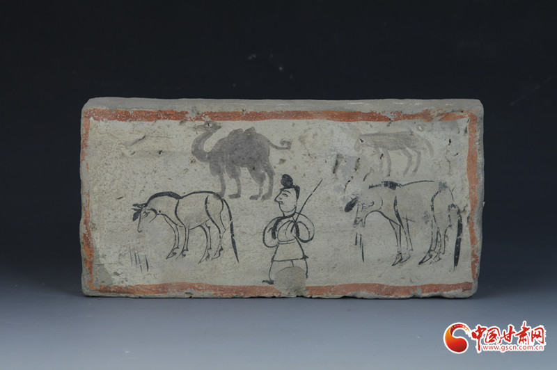 而在眾多璀璨的壁畫磚中,一件名為《牧馬、駱駝圖壁畫磚》的館藏一級文物,在美術(shù)界引發(fā)了強烈反響。這件壁畫磚現(xiàn)收藏于高臺縣博物館,畫面中央繪有一位身著交領(lǐng)短衫、緊腰束帶的牧人,他手執(zhí)長鞭,正在悠然放牧。草地上,馬群、駱駝、毛驢等牲畜或低頭覓食,或悠然自得。