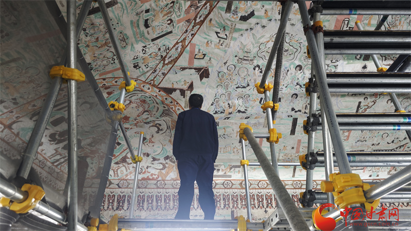 為了配合壁畫、彩塑修復(fù),第55窟共搭建了5層腳手架。修復(fù)師仰頭、彎腰、躺著作業(yè)是常態(tài),修復(fù)塑像時,甚至要跪著、趴著鉆進狹小空間,一待就是數(shù)小時,起身時腰酸背痛、腿腳發(fā)麻。
