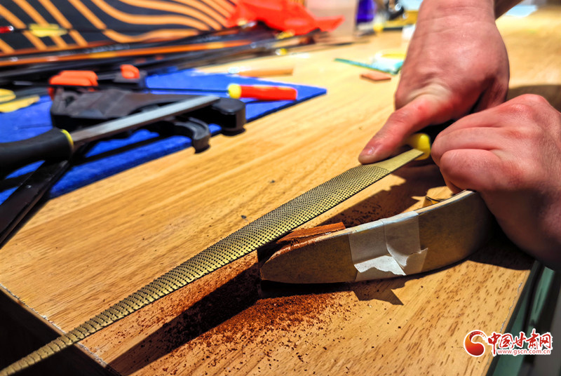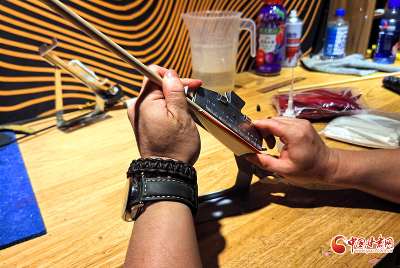 2011年,還是大學(xué)生的謝建戈在百度貼吧結(jié)識(shí)了山東臨沂“高氏傳統(tǒng)弓箭”非遺傳承人高超。囊中羞澀的他提出“先貨后款”,高超被這份赤誠(chéng)打動(dòng),寄來第一套玻片弓料。一個(gè)月后,生活費(fèi)一到賬,他第一時(shí)間把錢打了過去——網(wǎng)絡(luò)那端的高超從此記住了這個(gè)甘肅小伙。2012年,他做出人生第一把玻片弓。