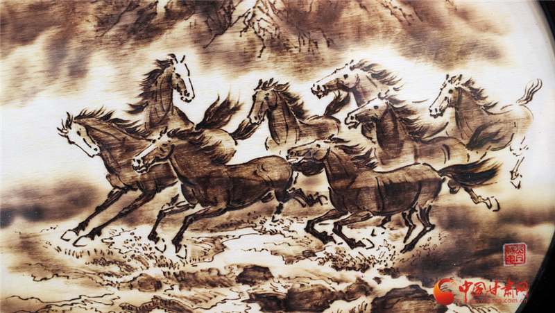從學(xué)徒到代表性傳承人,張志光的堅守藏在日復(fù)一日的練習(xí)里。他不僅精通山丹烙畫的選材、畫面設(shè)計及裝飾工藝,更在2018年邁出創(chuàng)新步伐——將山丹馬元素融入創(chuàng)作。手持電烙鐵在木板上游走,他筆下的山丹馬或奔騰跳躍、或昂首嘶鳴,線條流暢、明暗有致,仿佛被賦予生命,盡顯西北大地的豪邁神韻。“山丹烙畫是我一生的熱愛,早成了生活里離不開的部分。”張志光的話語里,滿是對這門技藝的深情。