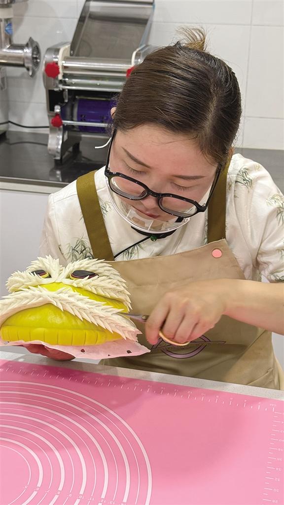 走進楊曉蘭的花饃小店,濃郁面香裹挾著藝術(shù)氣息撲面而來。展架上,威風凜凜的醒獅昂首欲嘯,憨態(tài)可掬的卡通角色惹人喜愛,盤踞的靈蛇栩栩如生……此刻,她正凝神制作醒獅花饃,搓、捏、塑形,面團在她指尖迅速呈現(xiàn)出獅頭的威武雛形。