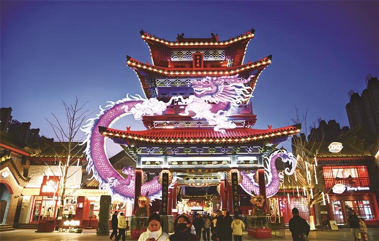 沿著青石板路前行,高達(dá)數(shù)米的“祥龍瑞躍”主燈組璀璨奪目;緊隨其后的“天驥呈祥”“花簇錦年”“福運(yùn)財(cái)神”等主題燈組依次鋪陳,仿佛將吉祥與喜慶灑滿街巷。老街外圍的現(xiàn)代燈陣不停變換,張掖丹霞的瑰麗、黃河波濤的壯闊,在光影中流轉(zhuǎn)成甘肅的壯美詩篇。