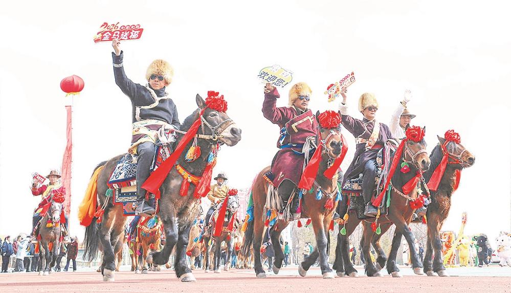 2月25日,肅南裕固族自治縣少數(shù)民族傳統(tǒng)項目體驗區(qū)內,社火表演隊的隊員們?yōu)楦髯迦罕姾陀慰捅硌菸璧浮侗枷蛭磥怼贰?nbsp;王將 鄧亞萍 攝