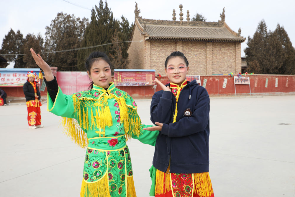 2月14日,在甘肅省蘭州市榆中縣,王欣怡(右一)、王欣語(yǔ)(右二)在社火表演排練間隙合影。新華社記者 張智敏 攝