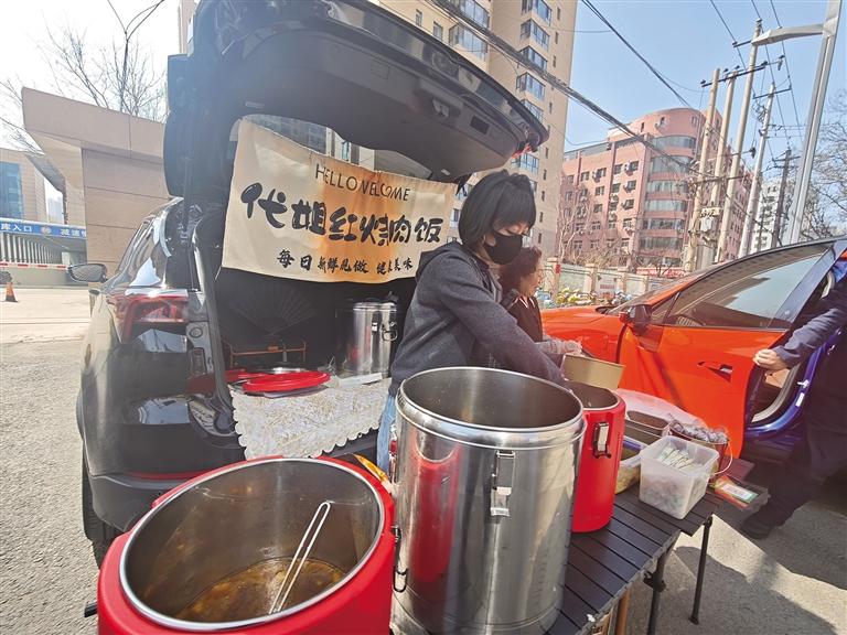 上午11時20分,甘南路民族飯店門口的人行道上,一輛簡易流動餐車準(zhǔn)時支起攤位。不銹鋼餐盆里,色澤鮮亮的炒肉片蓋飯熱氣升騰,濃郁香氣順著風(fēng)飄向周邊寫字樓,短短幾分鐘,攤位前就排起了七八人的小長隊。“老板,一份炒肉片蓋飯,多放青椒和咸菜!”“我要兩份,打包帶走!”熟練打飯、快速裝盒、掃碼收款,一氣呵成,不到20分鐘,桶里的米飯就下去了小半桶。